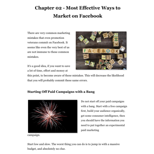 Introducing Facebook Marketing. Inside this ebook, you will discover the topics about facebook marketing - mistake to avoid, most effective ways to market on Facebook, what is Facebook page marketing, what is Facebook group marketing, influencer page outreach, paid page boost campaign, paid traffic campaigns paid lead generation campaigns, facebook pixel retargeting campaign and optimizing your facebook ads campaigns.
