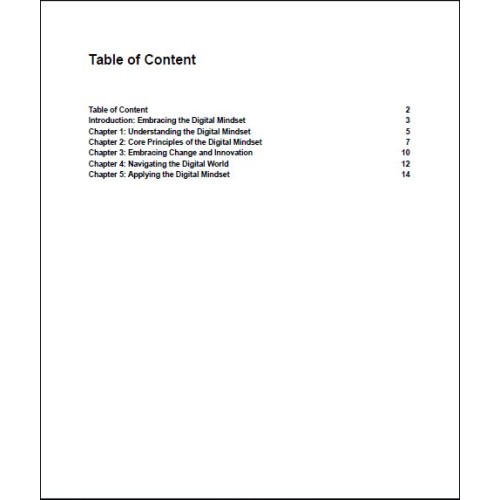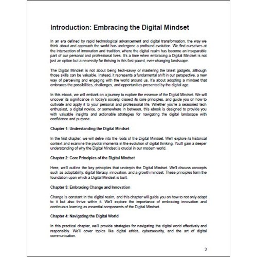 In an era defined by rapid technological advancement and digital transformation, the way we think about and approach the world has undergone a profound evolution. We find ourselves at the intersection of innovation and tradition, where the digital realm has become an inseparable part of our personal and professional lives. It's a time when embracing a Digital Mindset is not just an option but a necessity for thriving in this fast-paced, ever-changing landscape. The Digital Mindset is not about being tech-savvy or mastering the latest gadgets, although those skills can be valuable. Instead, it represents a fundamental shift in our perspective, a new way of perceiving and engaging with the world around us. It's about adopting a mindset that embraces the possibilities, challenges, and opportunities presented by the digital age. In this ebook, we will embark on a journey to explore the essence of the Digital Mindset. We will uncover its significance in today's society, dissect its core principles, and guide you on how to cultivate and apply it to your personal and professional life. Whether you're a seasoned tech enthusiast, a digital novice, or somewhere in between, this ebook is designed to provide you with valuable insights and actionable strategies for navigating the digital landscape with confidence and purpose.